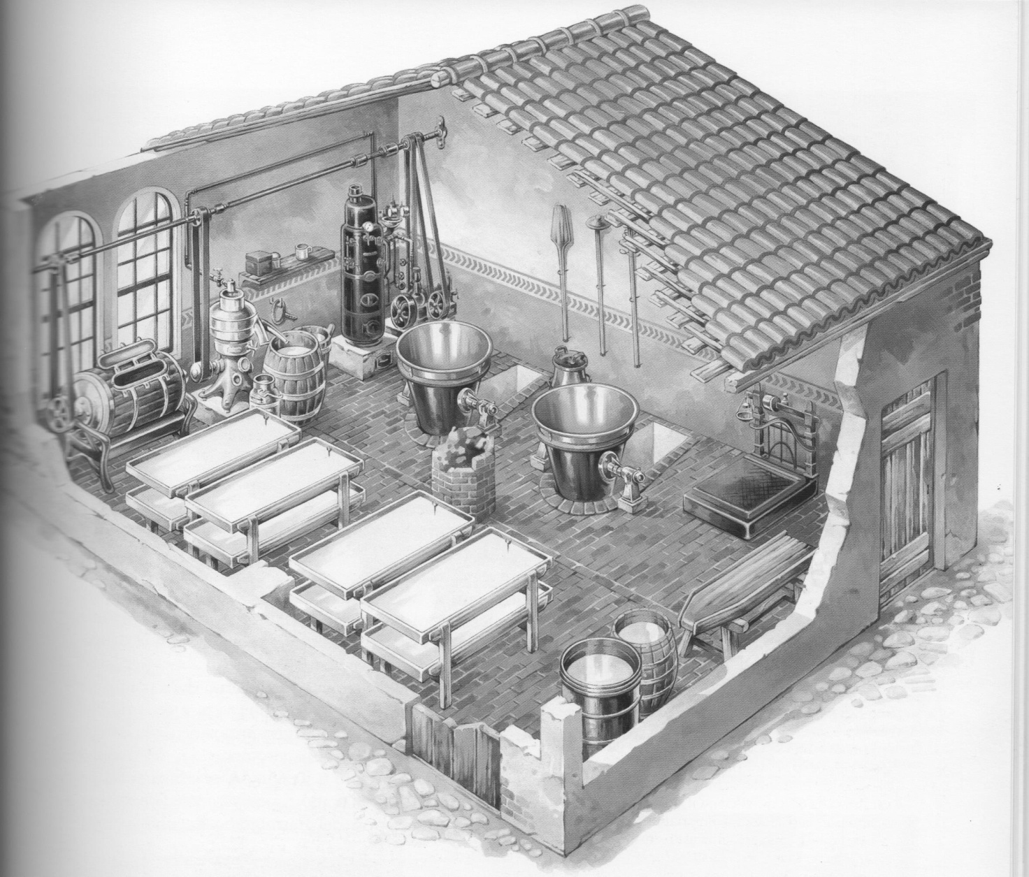 Immagine di un ipotetico caseificio di inizio novecento secondo il pittore Amos Nattini, con la dubbia presenza di molte donne. Nella seconda immagine vediamo la schematizzazione di un caseificio anni '40.